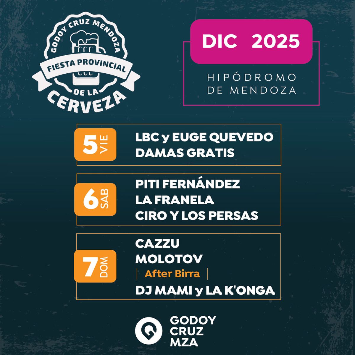 La edición 18 de la Fiesta de la Cerveza 2025 ya tiene a todos los artistas confirmados para las tres noches del 5 al 7 de diciembre, y Godoy Cruz dio a conocer qué día estará cada artista y banda. Las entradas ya están a la venta  en passline y se espera que miles de mendocinos disfruten de los shows como todos los años.