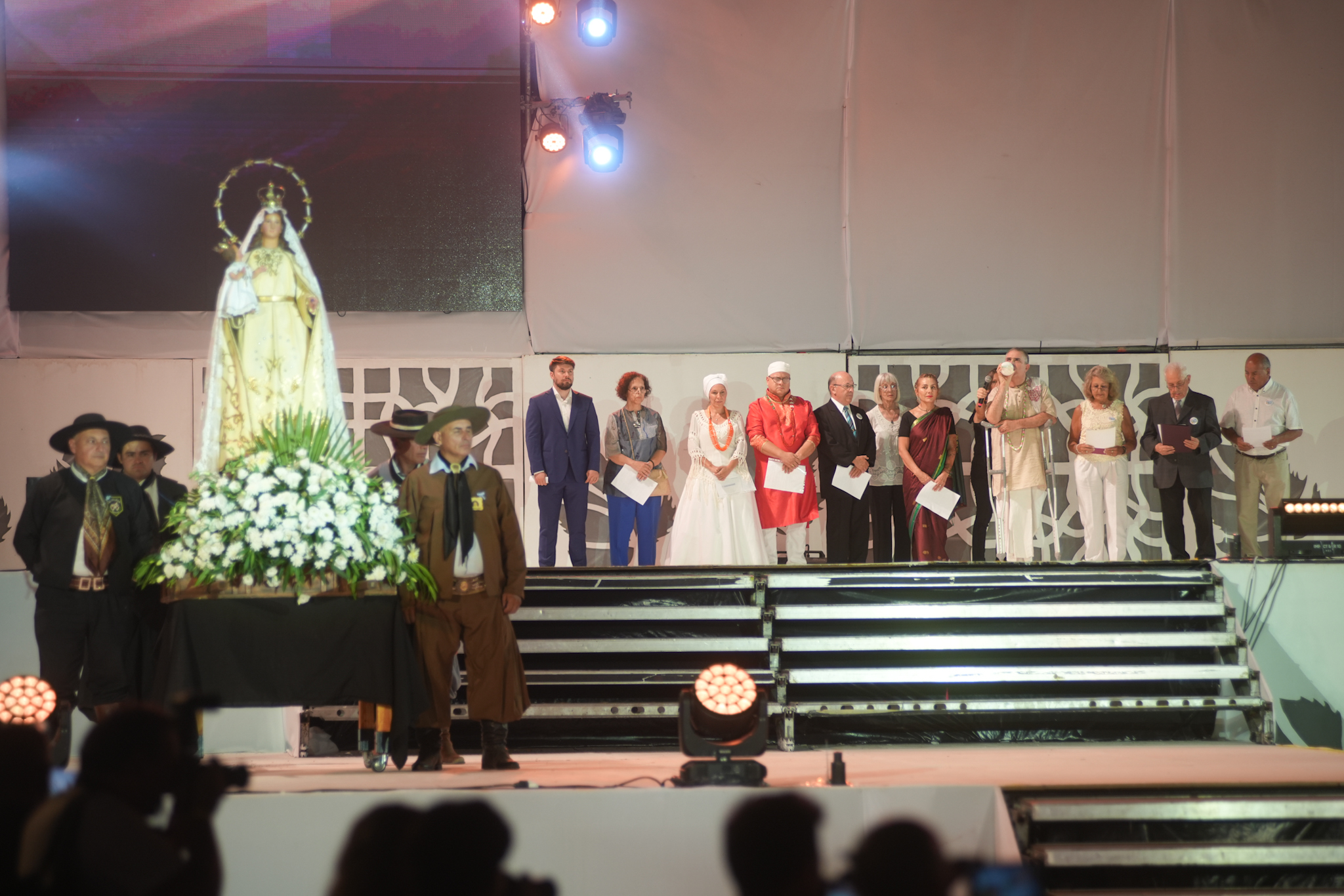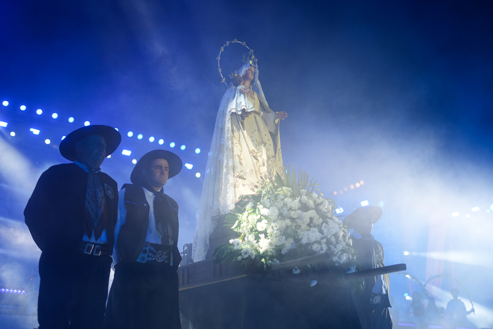 Uno de los momentos más significativos fue la llegada en procesión de la Virgen de la Carrodilla, protectora de los viñedos, acompañada por cosechadores y asociaciones gauchas. Su entrada estuvo marcada por cantos y danzas tradicionales, en un clima de recogimiento y devoción popular.